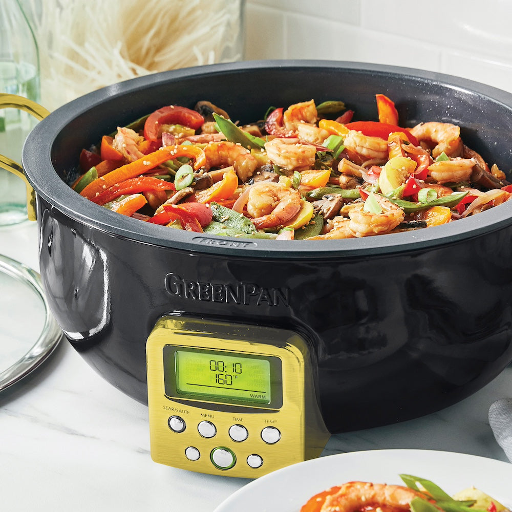 GreenPan’s Elite Essential Smart Skillet is your all-in-one countertop powerhouse. With 10 modes—Stir-Fry, Sauce, Soup, Steam, Simmer, Warm, Sear/Sauté, White Rice, Brown Rice, and Grains—you can whip up quick veggie stir-fries, silky pasta sauces, comforting soups, fluffy rice, or perfectly seared proteins all in one family-sized 6QT pan. The tall sides keep splatter under control while giving you space to stir, toss, or simmer with ease. Just plug it in, select your mode, and let the cast-in element deliver fast, even heating for every dish.