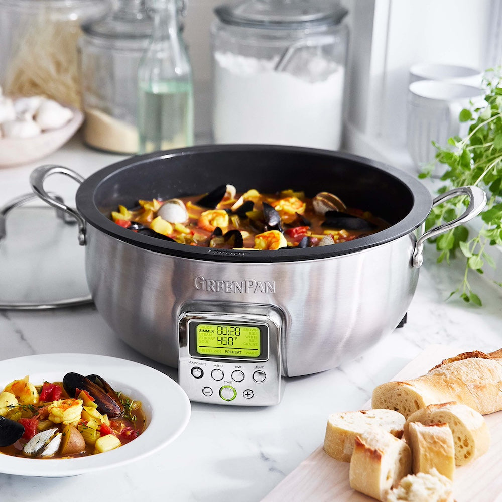 GreenPan’s Elite Essential Smart Skillet is your all-in-one countertop powerhouse. With 10 modes—Stir-Fry, Sauce, Soup, Steam, Simmer, Warm, Sear/Sauté, White Rice, Brown Rice, and Grains—you can whip up quick veggie stir-fries, silky pasta sauces, comforting soups, fluffy rice, or perfectly seared proteins all in one family-sized 6QT pan. The tall sides keep splatter under control while giving you space to stir, toss, or simmer with ease. Just plug it in, select your mode, and let the cast-in element deliver fast, even heating for every dish.